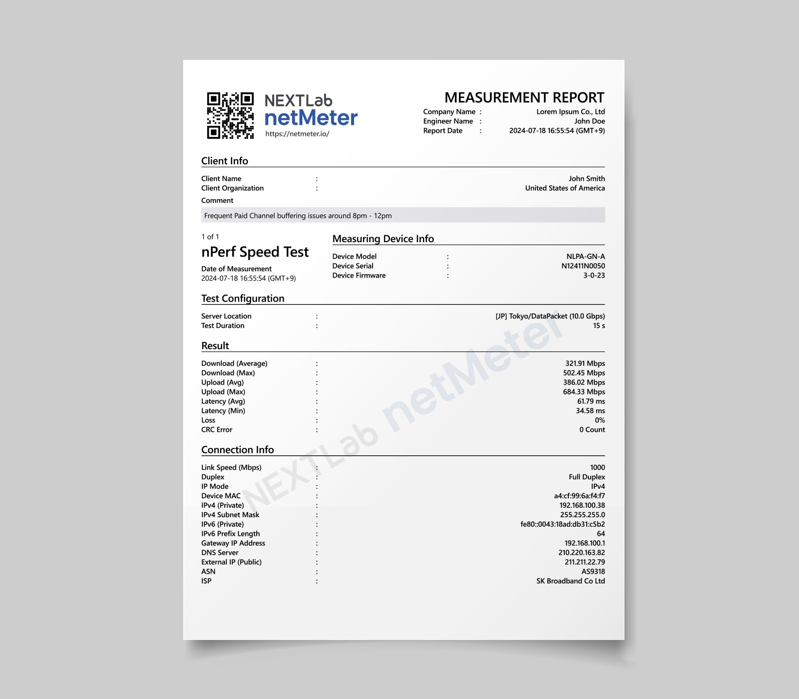 Powered by nPerf, netMeter allows users to conduct reliable TCP Throughput Tests from anywhere in the world, leveraging over 2,000 nPerf Speed Test servers globally. Users can perform tests with a maximum throughput of 1Gbps in both directions, either automatically selecting the nearest server or manually choosing servers from a desired country/location.